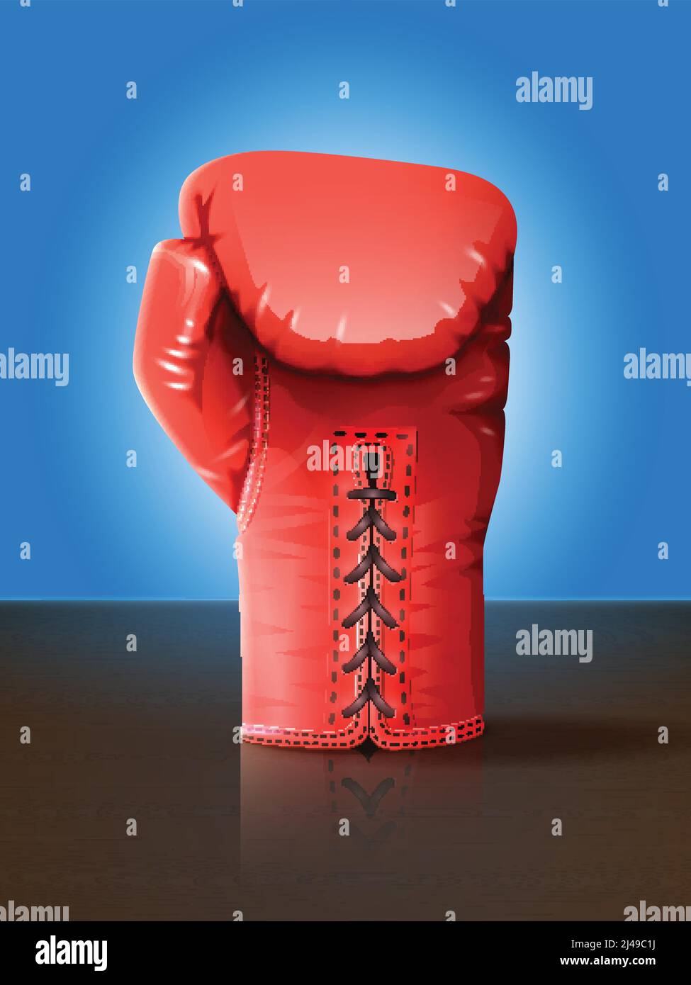 Realistic red leather boxing glove on wooden table vector illustration