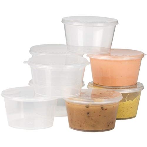 100pack Of Disposable Clear Plastic Condiment Storage Cups With Lids Condiment Cups With Lids  Above all, glass condiments cups do not discolor, retain smells, or leach chemicals into your dishes. These condiments cups with lids are not just elegant to look at but can also help you create a mise en place for an easier and organized meal preparation. 5/5         (1 387) 5/5         (1 387) Condiment Cups With Lids.