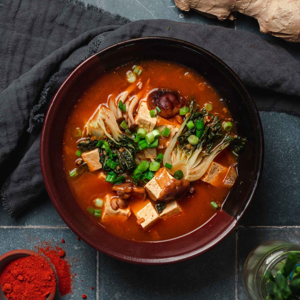 Kimchi Soup Recipe Kimchi soup, called jjigae, is a satisfying example. Learn how to make a vegetarian kimchi soup with silken tofu, daikon radish, and lucky foods kimchi and hot sauce. The fermented kimchi vegetables quickly provide deep flavor to the broth, so the soup can be produced in little more than half an hour. This healthy and easy soup is delicious served. Kimchi Soup Recipe.