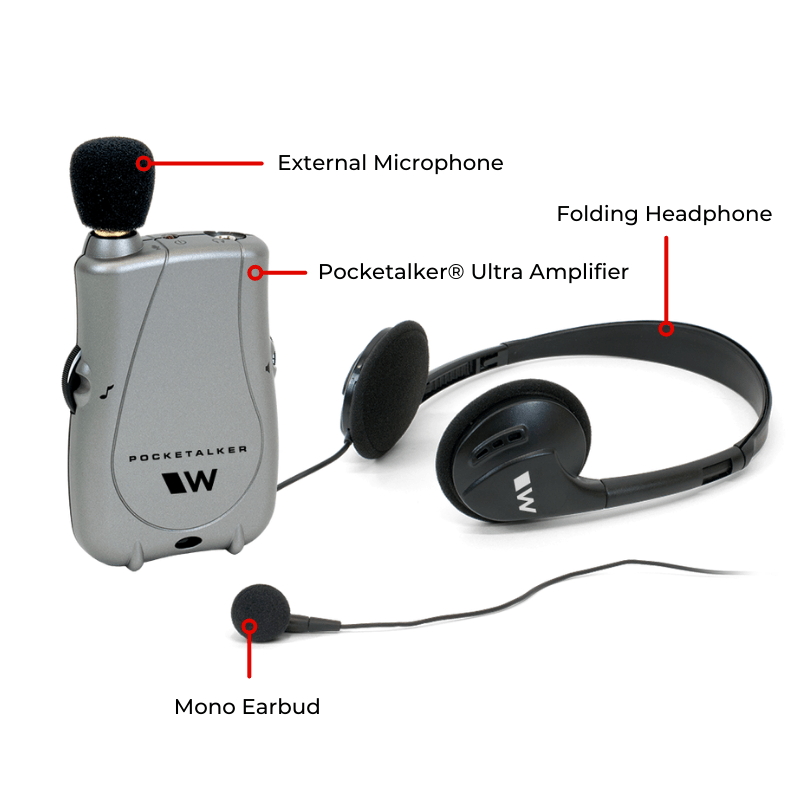 Pocketalker is a hearing assistance solution that amplifies sounds and voices in your life. Use with or without hearing aids, adjust volume and tone, and choose. The pocketalker pro amplifies sound. Pocketalker ultra is a system that amplifies sounds and reduces background noise for better listening. It includes a personal amplifier, a microphone, earphones, headphones, batteries and accessories. A hearing amplifier that reduces background noise. It helps you stay connected and involved with your healthcare.