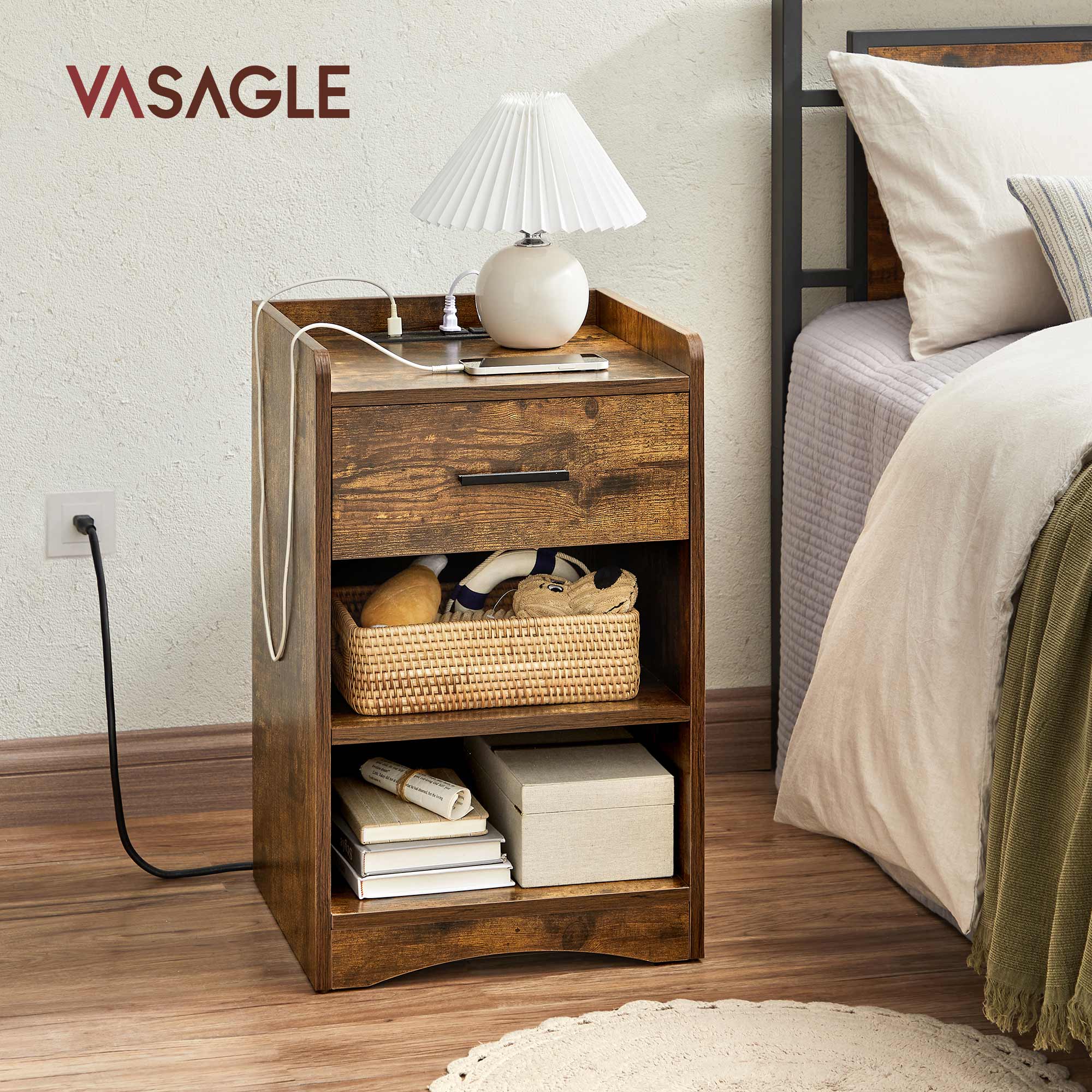 Rustic Brown Wooden Side Table with Drawer VASAGLE