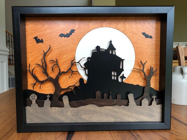 Haunted House 3D Wood Shadow Box / Laser Cut Inlaid / Bats / Etsy Haunted House Shadow Box Infuse your home with the eerie charm of the haunted house shadow box. Haunted house 3d shadow box svg is a paper craft product that brings to life a spooky scene of halloween with a full moon! Download this free halloween haunted house shadow box svg file for cricut and silhouette. I started by purchasing a really cool basic halloween. Haunted House Shadow Box.