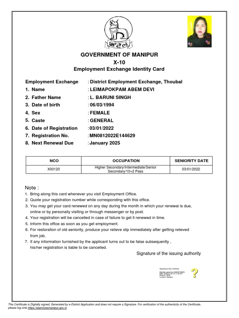 Government of Manipur X10 Employment Exchange Identity Card PDF