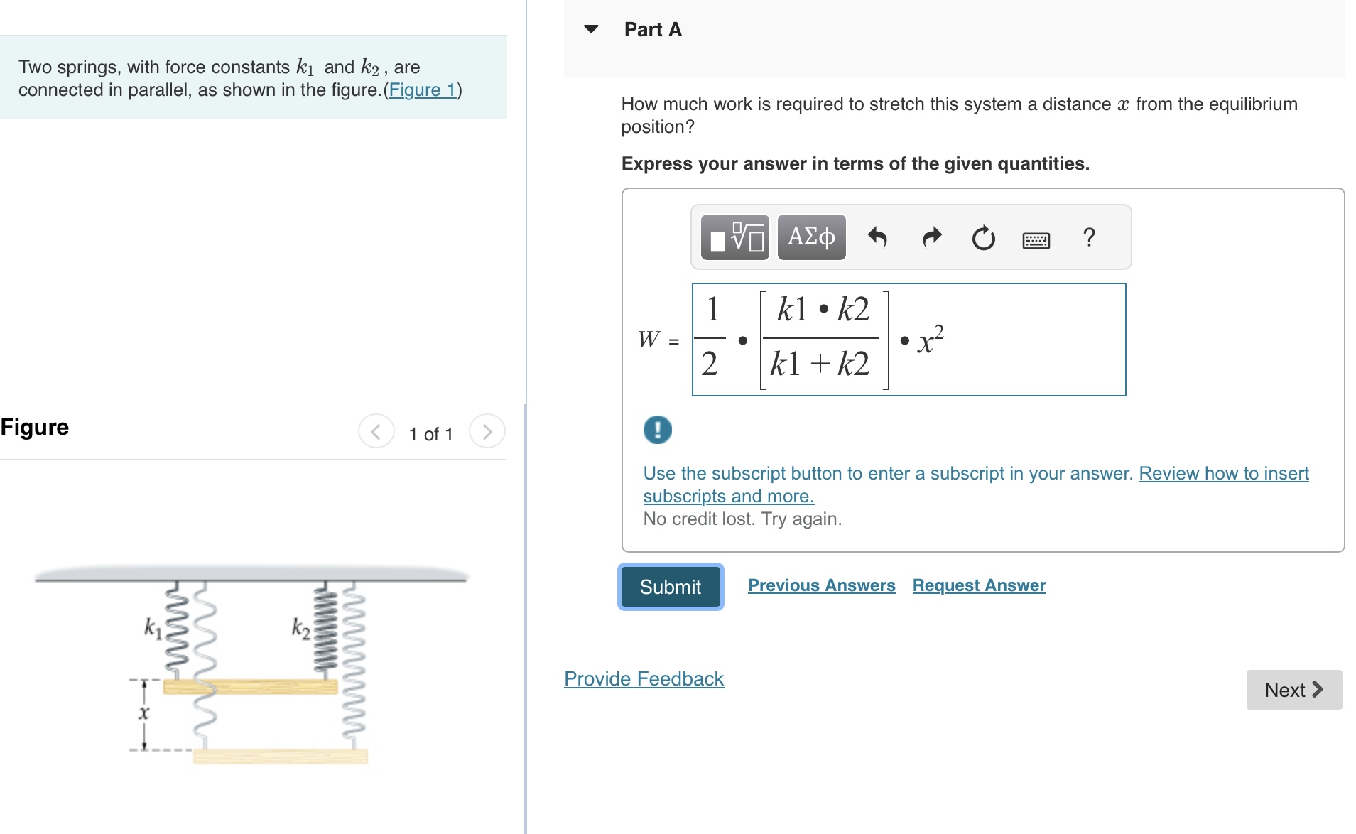 Solved Two springs, with force constants k1 and k2, are