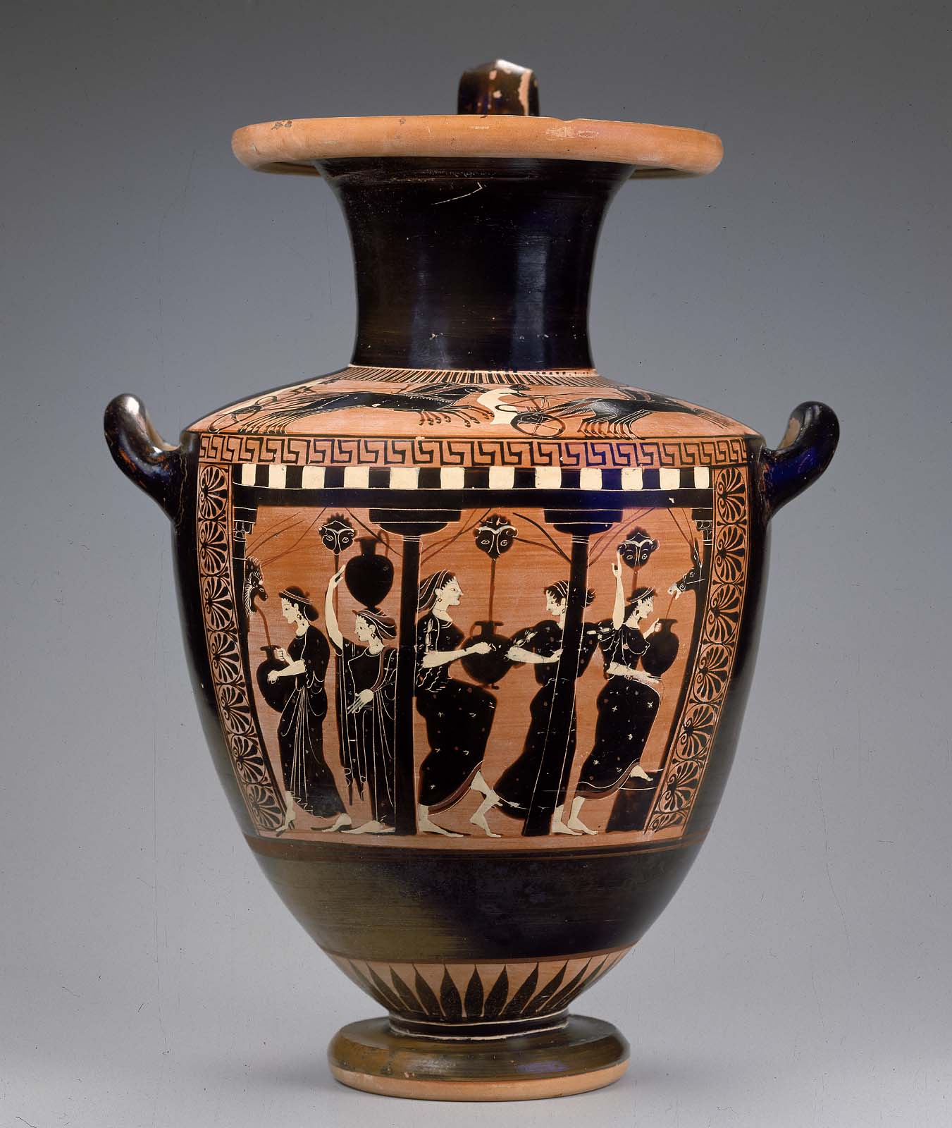 Greek black figure vase of women at a fountain Copyright Ancient Greek Vase Woman Unlike archaic vases covered in war scenes, and epic warrior poems from this era, most early iron age pots captured the world of greek women. That vase painters broadened their repertoire to include scenes of daily life that focused on women engaged in domestic activities. Greek vase paintings can provide a wealth of fascinating information about the culture of ancient. Greek Vase Woman.