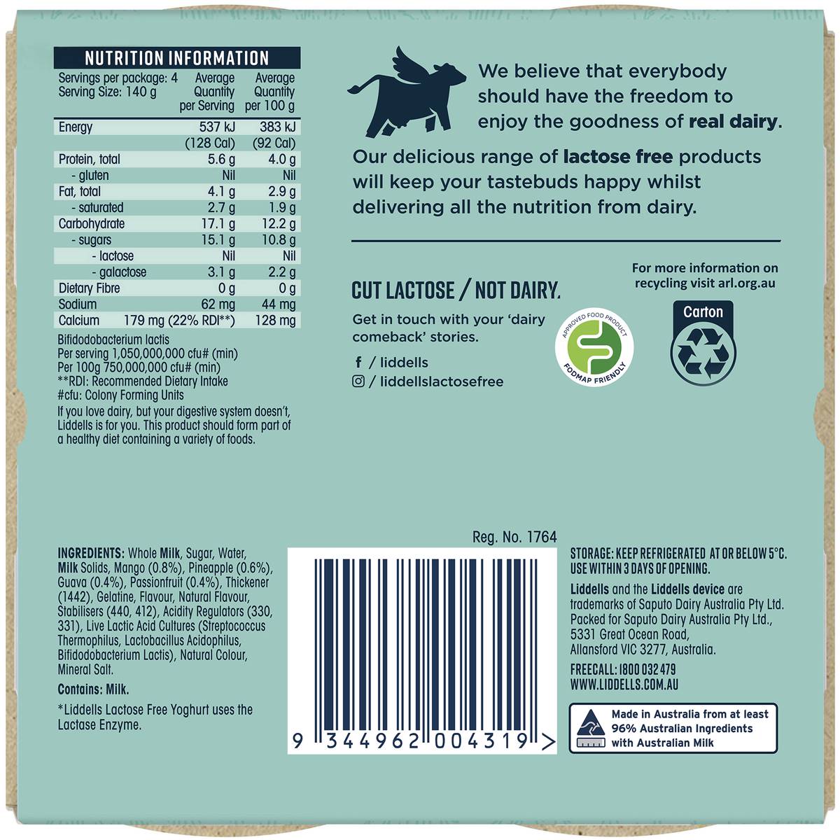 Liddells Lactose Free Probiotic Yoghurt Tropical 140g X 4 Pack Woolworths