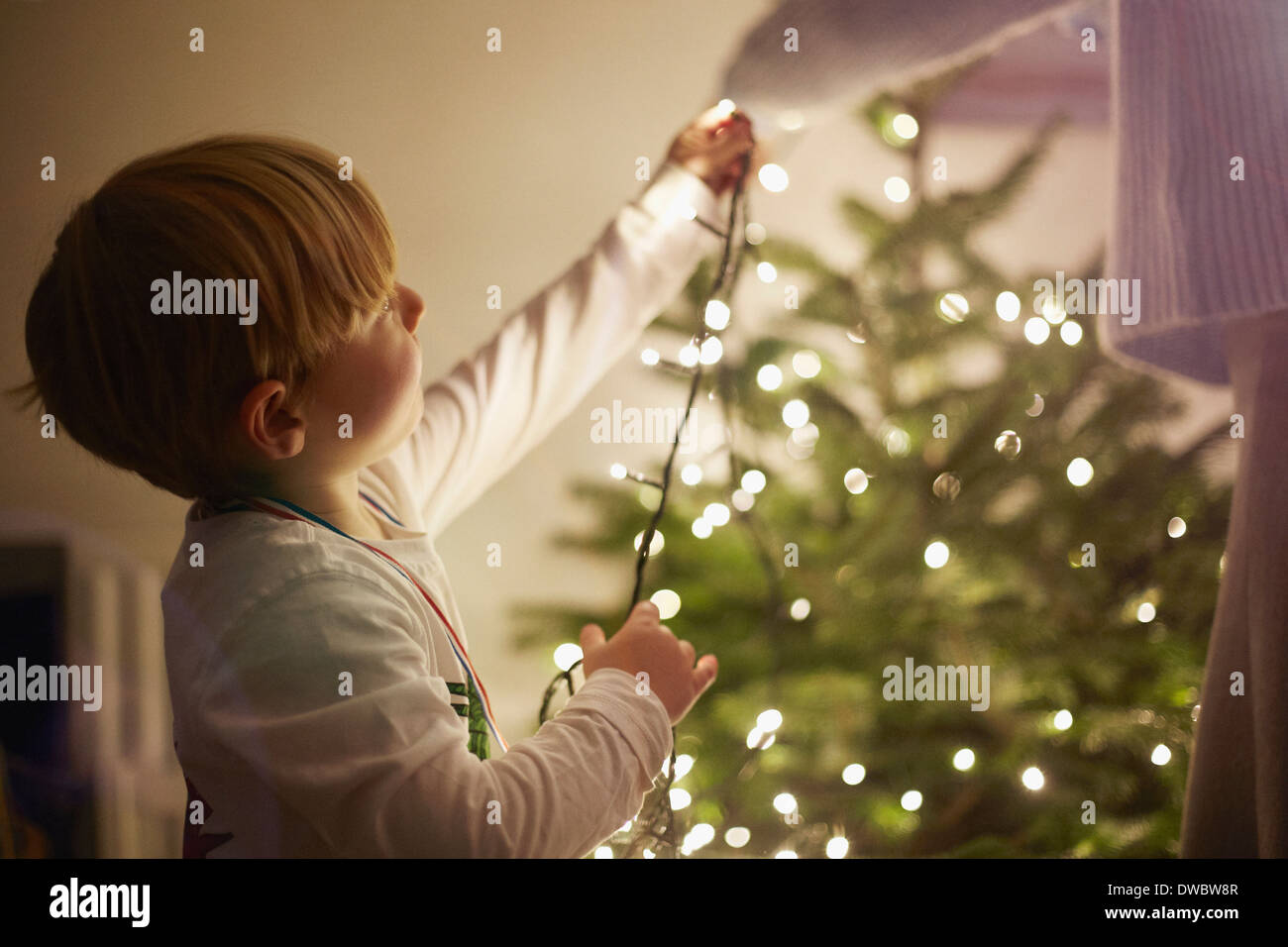 Young boy putting up christmas tree lights Stock Photo Alamy Putting Christmas Lights On The Tree A beautifully lit christmas tree is a hallmark of the season that’s sure to spread holiday cheer. how to put lights on a christmas tree. how to put lights on a christmas tree the right way. As long as your plugs and outlets are oriented properly, there's really no wrong way to hang fairy lights on a. . Putting Christmas Lights On The Tree.