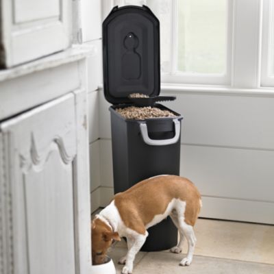 The simplehuman large steel pet food can keeps food fresh and pets out with a convenient scoop that magnetically attaches under the lid. A silicone gasket forms an airtight seal so food stays fresh. A silicone gasket forms an airtight seal so food. Silicone gasket forms an airtight seal so food stays fresh. Has an airtight seal to ensure food stays fresh. Der simplehuman tierfutterbehälter hat einen robusten, lockerungssicheren griff, damit das futter im behälter bleibt und haustiere draußen.