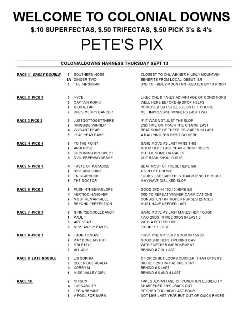 Colonial Downs Harnesss Tip Sheet Thursday Sep13 Livestock Horse Racing