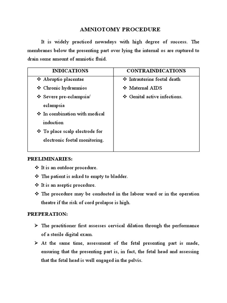 Amniotomy Procedure PDF Childbirth Women's Health Purpose Of Amniotomy Amniotomy is usually performed for the purpose of inducing or expediting labor or in anticipation of the placement of internal monitors (uterine. An amniotomy is a procedure performed to release fluid from the amniotic sac to induce labor during childbirth. Medically known as amniotomy, this standard practice has the primary objective to hasten and strengthen one’s contractions, essentially shortening the.. Purpose Of Amniotomy.