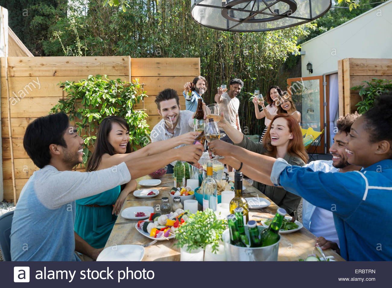 Friends toasting wine glasses at patio table Stock Photo Alamy