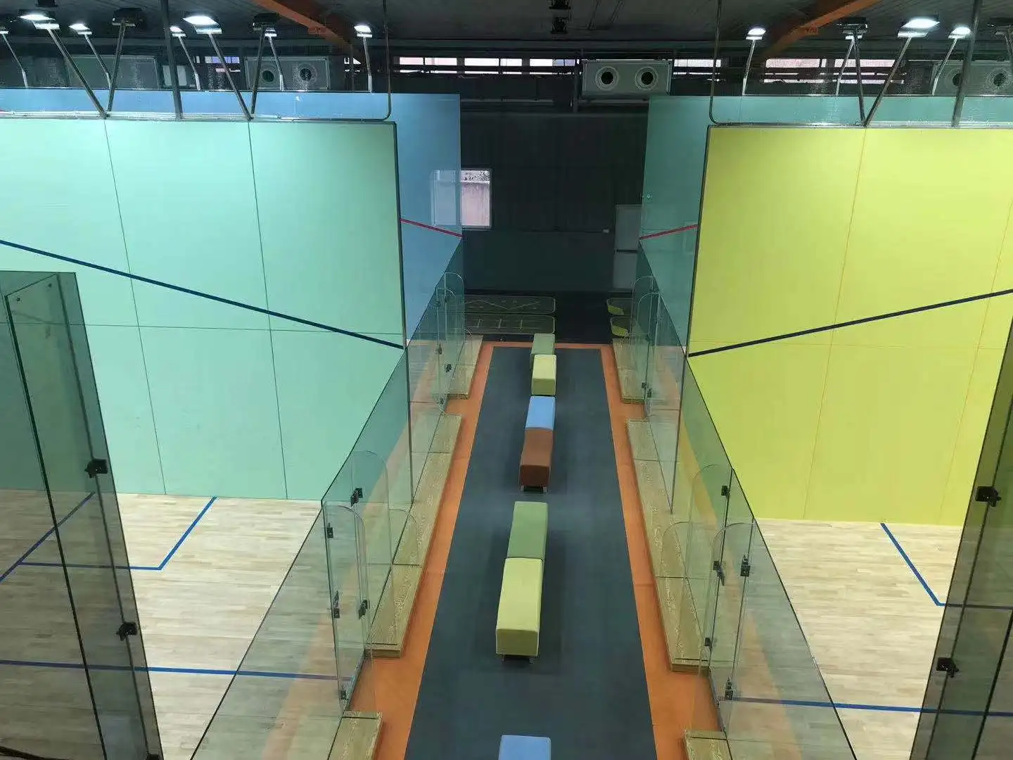Full Glass/wood Walls Squash Court Construction Portable Squash Court Squash Glass Floor One of our main focuses during the development of this brand new court. Doubleplay structural walls are strong, safe and aesthetically pleasing. The ct glass court is the perfect showpiece for professional squash. The flooring in show glass courts differs significantly in color compared to standard squash courts. 165 glass panels of different dimensions, laid out on the aluminium support. Squash Glass Floor.