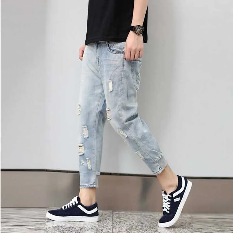 Summer Jeans Men Hole Ripped Stretchy Jeans Hip Hop Drop Crotch Pants