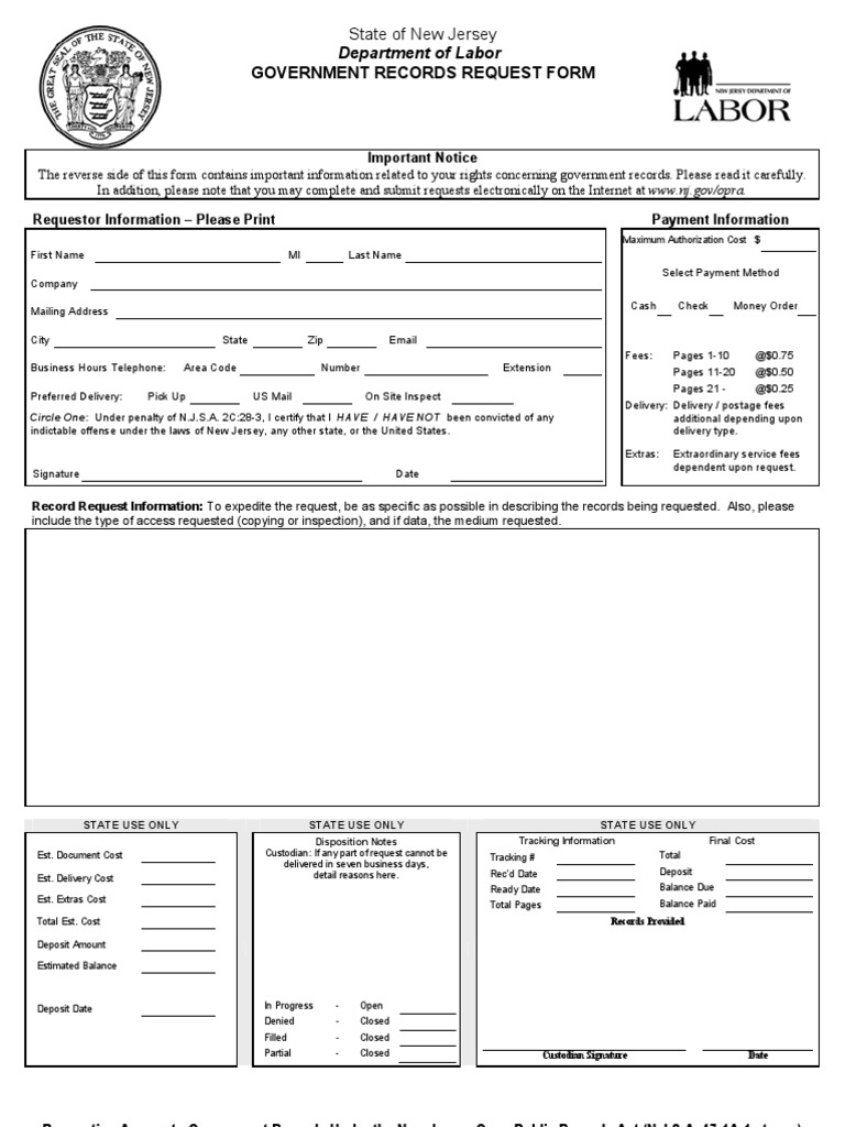 Department of Labor opra request form Mail Government
