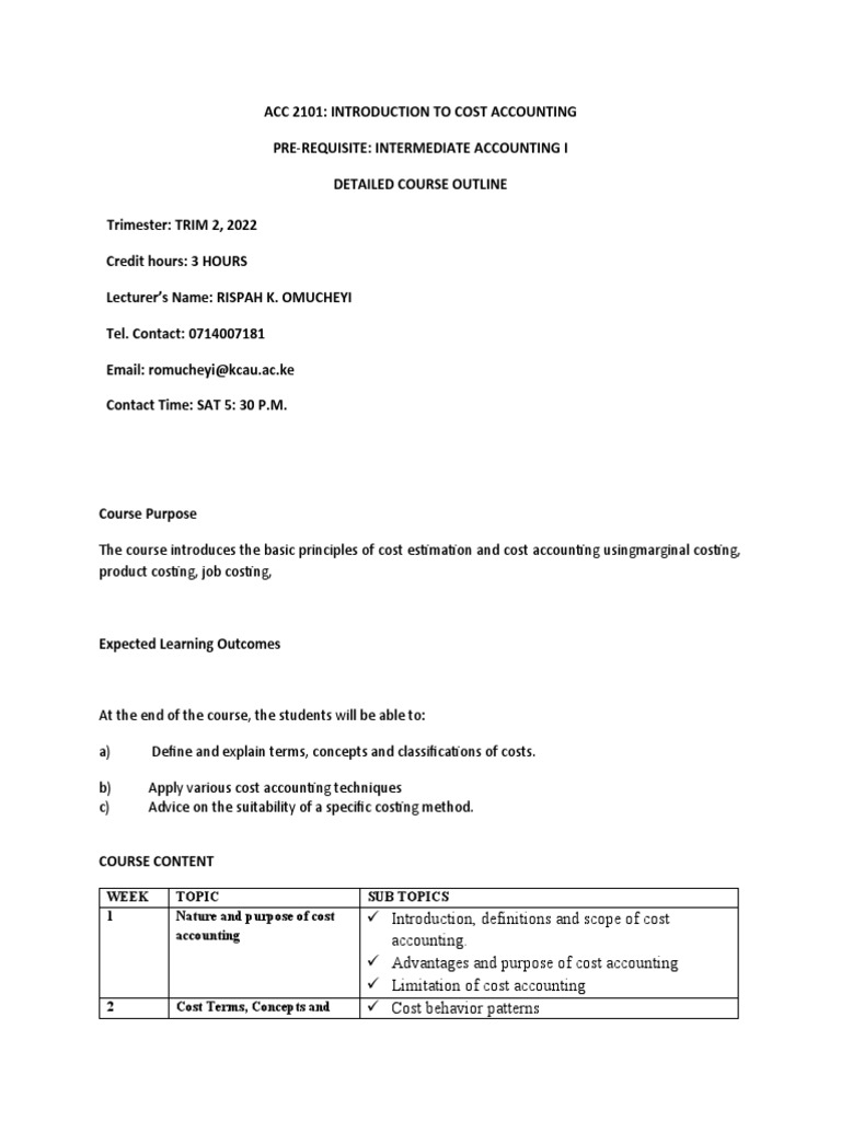 Intro To Cost Accounting Course Outline PDF Cost Accounting