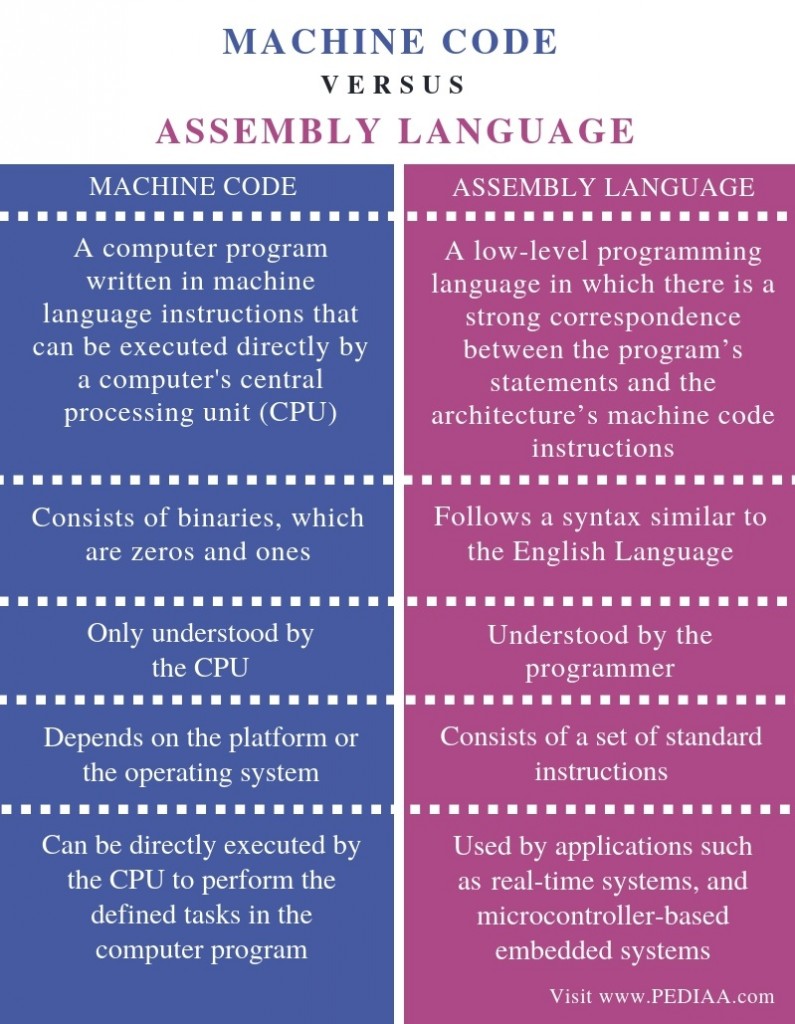 Difference between Machine Language and Assembly Language with Comparison Chart What Is Machine Language And Assembly Language With assembly language you use mnemonic. Assembly language is a convenience mechanism over the machine language. Machine languages use the binary format along with octadecimal and. Difference between machine language and assembly language: What Is Machine Language And Assembly Language.