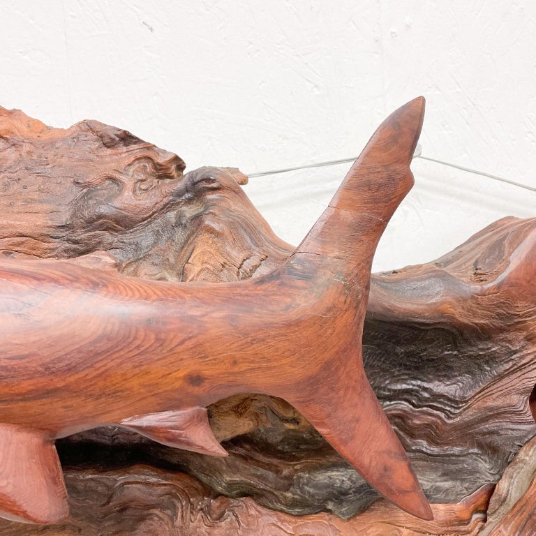 1970s Wall Art Shark and Swordfish Fish Sculpture Hand Carved Exotic