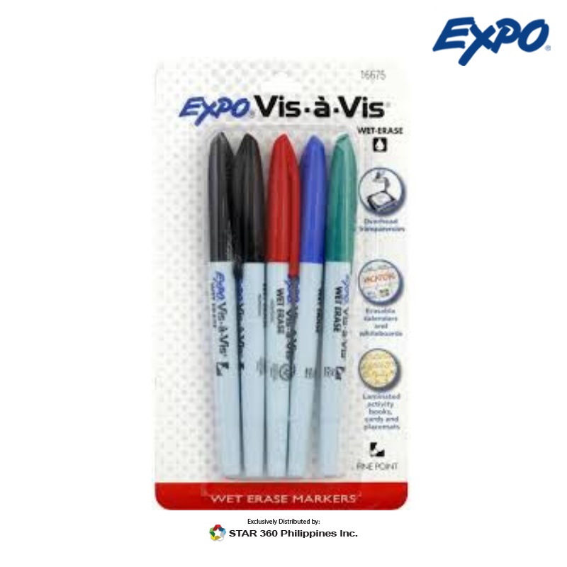 EXPO VisaVis WetErase Markers, Assorted Colors, Pack Of 4 Chisel Tip Vis A Vis Expo dry erase marker variety pack with an assortment of fine and chisel tip markers. For use with whiteboards, hard plastic, laminated sheets, and other nonporous surfaces. Overhead projection markers designed specifically for acetate films, such as transparencies and laminated boards. For use with whiteboards, hard plastic, laminated sheets, and other nonporous surfaces. For use with whiteboards, hard plastic, laminated. Chisel Tip Vis A Vis.