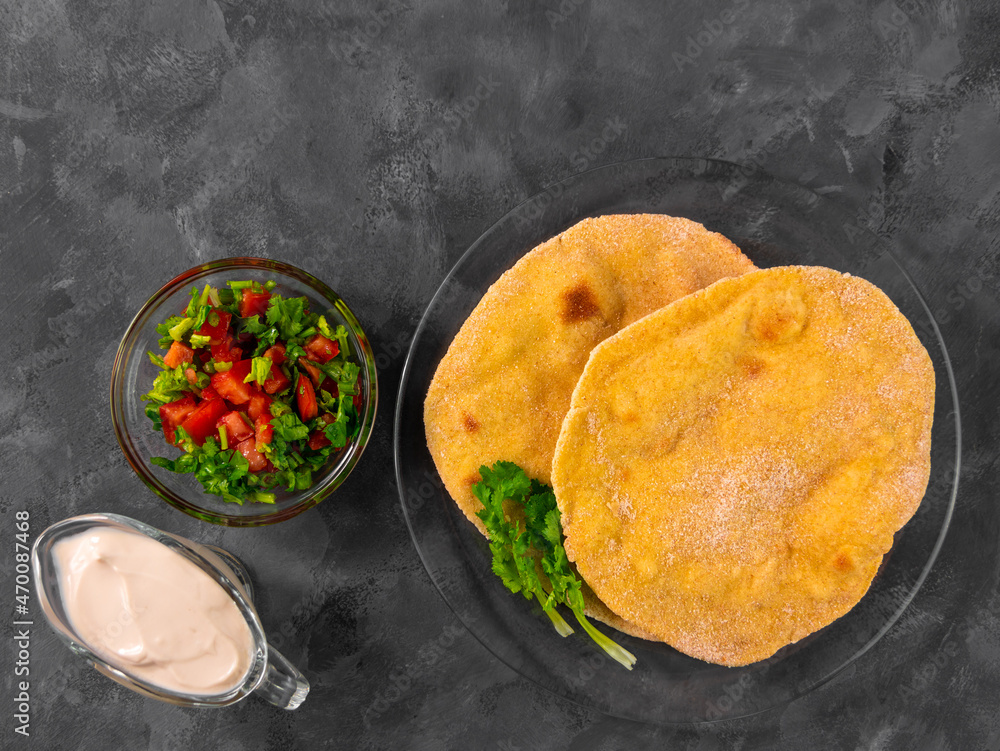 Homemade corn flatbread cilantro greens tomato salsa. Handmade mexican