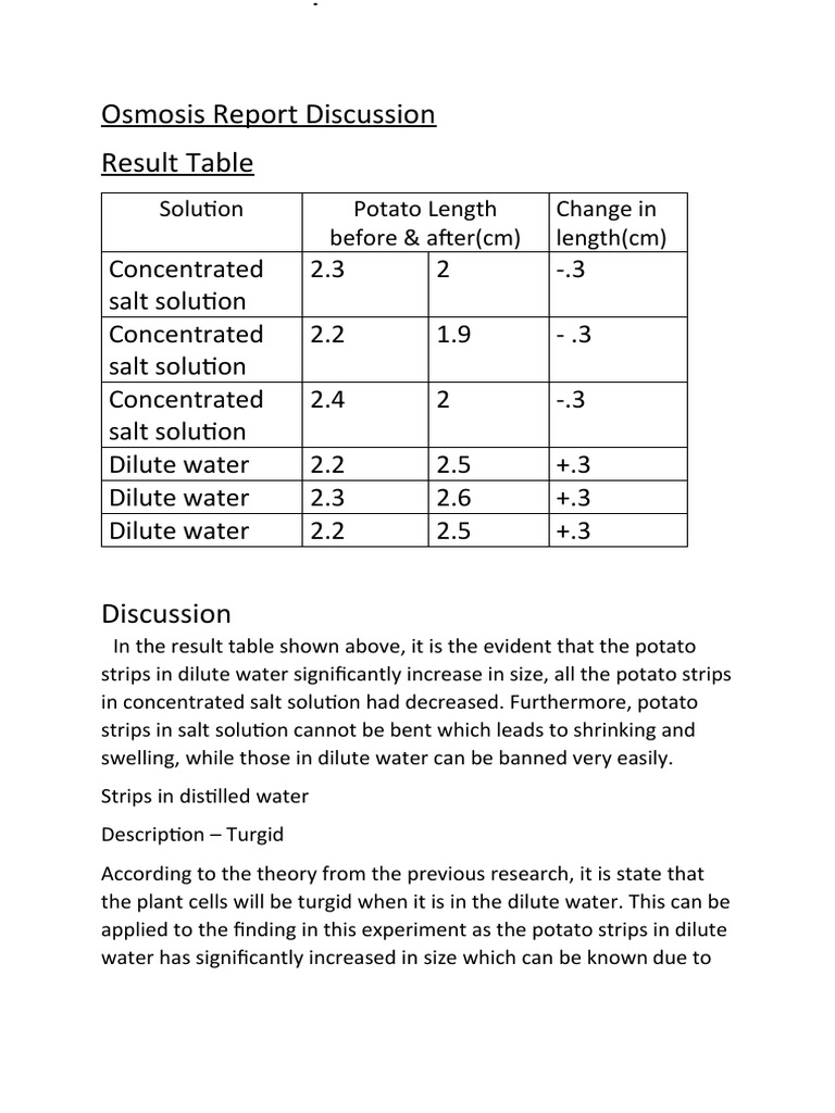 Potato osmosis lab results. Sample Lab Report. 20221027 Osmosis Lab Report Discussion Diffusion and osmosis shown in solutions section 1: The effect concentration levels have on the process of osmosis. Osmosis can be easily demonstrated in biological systems using potato strips, water and salt or sugar solution. Osmosis is the movement of water molecules. Diffusion is the net movement of molecules from a high concentration to low. In many experiments performed by. Osmosis Lab Report Discussion.