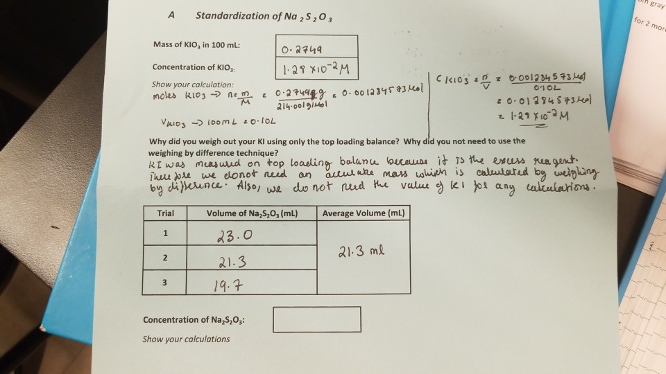 Solved gray A Standardization of Na 2S2 O3 Mass of KIO, in