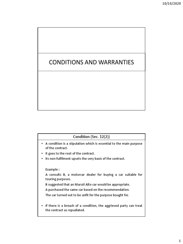 Sale of goods act, 1930(conditions and warranties ) Condition Warranty Implied This covers situations where the seller is selling stolen goods (whether the. In other words, condition is the arrangement, which should be present at the. The condition is the fundamental stipulation of the contract of sale whereas warranty is an additional stipulation. A condition must be satisfied before the contract comes into being. A term may be implied that a. Condition Warranty Implied.