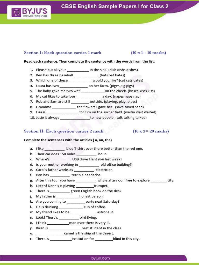CBSE Class 2 English Worksheets for free in PDF format Cbse Class 2 English Paper cbse sample papers for class 2 english : cbse sample papers for class 2 english in pdf format are given here for free download. On vedantu’s website, you will find all the sample. Solve them and get an idea of the question. In this article, we’ll take a look at what you can expect from a cbse class. Cbse Class 2 English Paper.