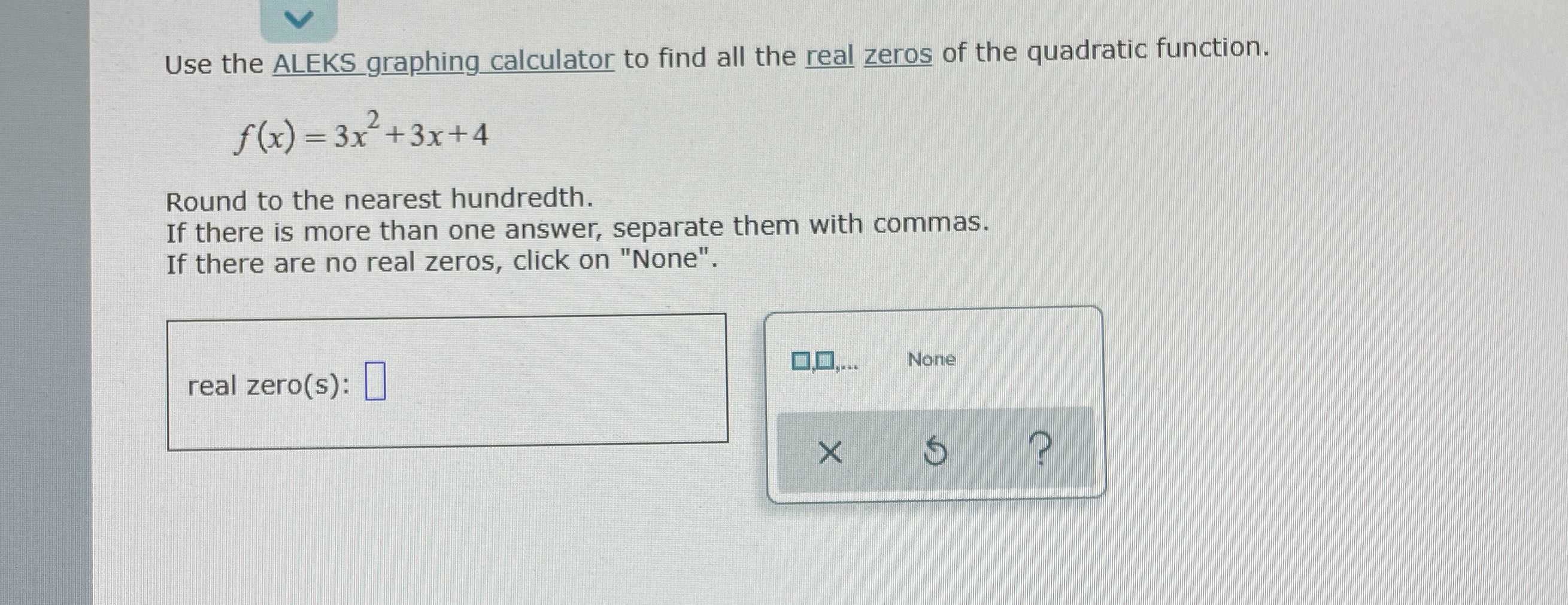Use the ALEKS graphing calculator to solve the system of equations. y=2x² 4x1 y = 3x+10 Aleks Graphing Calculator Explore math with our beautiful, free online graphing calculator. Graph functions, plot points, visualize algebraic equations, add sliders,. Aleks is an adaptive learning platform for math, chemistry, statistics and more. Interactive, free online graphing calculator from geogebra: Graph functions, plot data, drag sliders, and much more! Create an account or log in to get started. Before you take the aleks. Aleks Graphing Calculator.