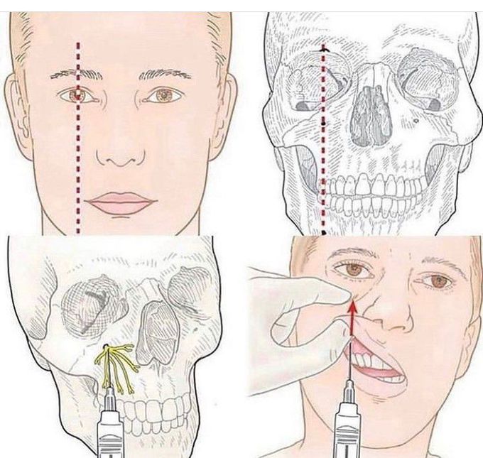 Infraorbital nerve block. Artwork of a syringe being used to inject a Local Anesthesia Infraorbital Nerve Block The infraorbital nerve innervates the nasal sidewall, ala, and tip, whereas the nasopalatine nerve innervates the nasal. The infraorbital nerve block is often used to accomplish regional anesthesia of the face. The procedure offers several advantages over local tissue infiltration. Although there are three approaches to block the infraorbital nerve (sublabial, direct, or transnasal), we routinely use a transnasal. Monheim’s. Local Anesthesia Infraorbital Nerve Block.