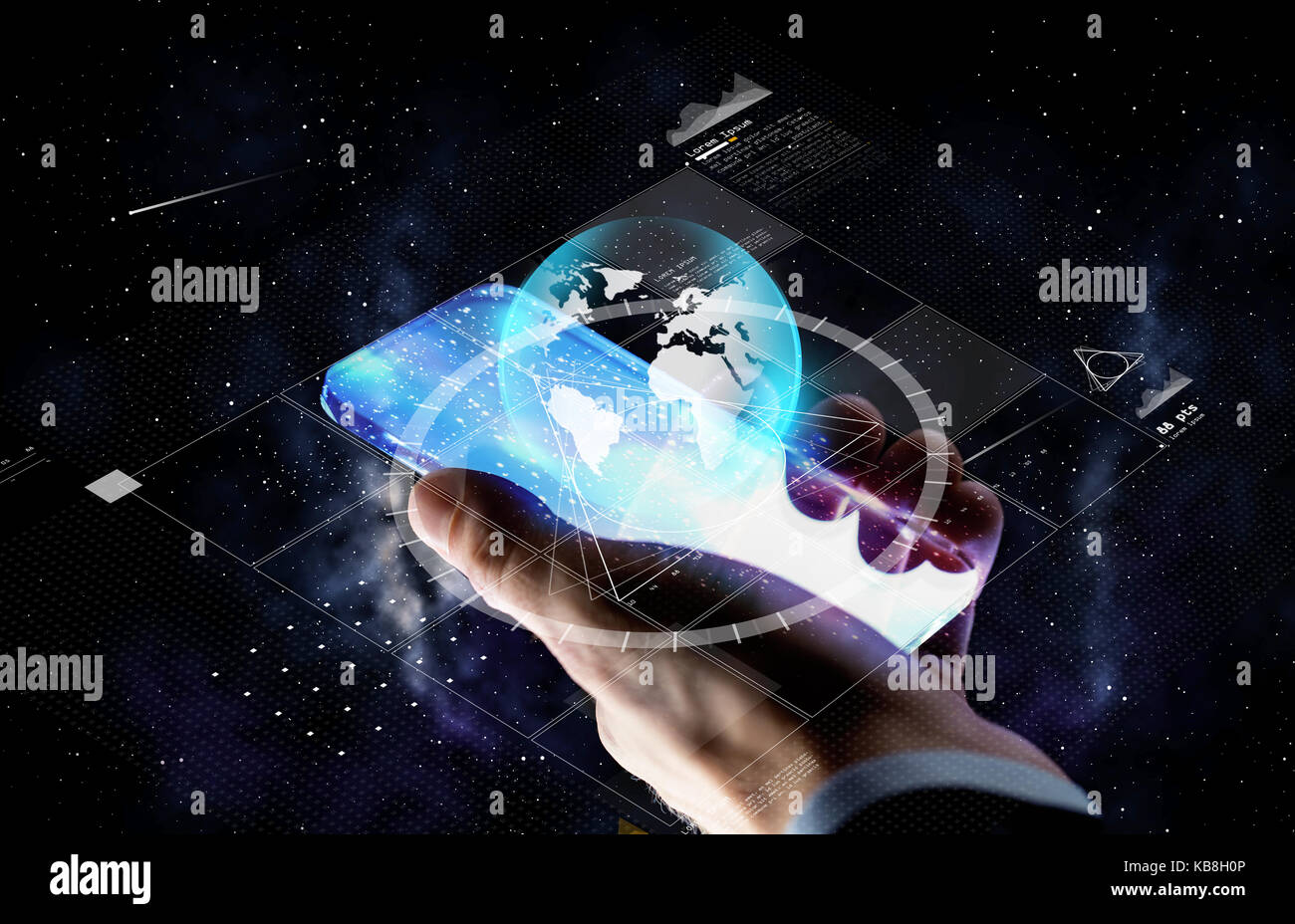hand with smartphone and earth projection Stock Photo Alamy