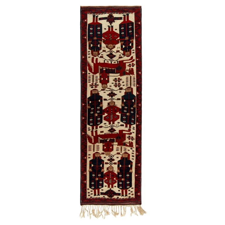 1950s Vintage Tribal Rug in Red, Blue and Beige Pictorial Folk Art by