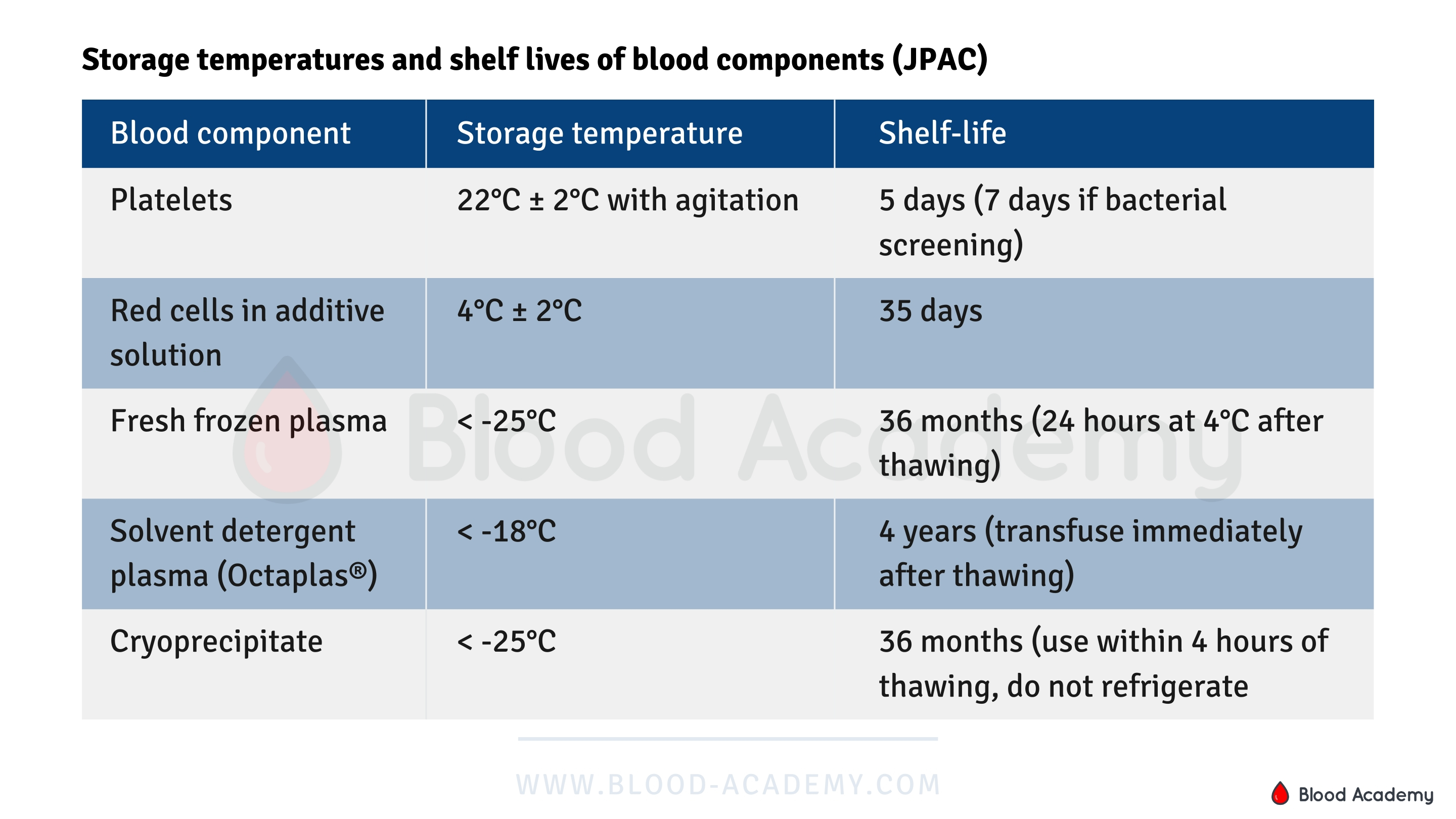 Storage temperatures and shelf lives of blood components (JPAC) Blood