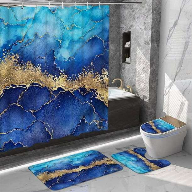 Marble Shower Curtain, Blue Gold Marble Shower Curtain Set