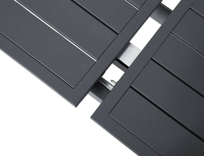 CBM Patio Cast Aluminum 9 Piece Extension Dining Table Set with 2 Aluminium Outdoor Extension Table This table highlights its functionality with 3 extension sizes to meet different dining demand from 6 to 10 people to enjoy their dinner time. With enough space for four to six chairs, you can start hosting the same day you get your table. With its extension design and quality aluminum, this table conveniently expands to make it easy for you. Aluminium Outdoor Extension Table.