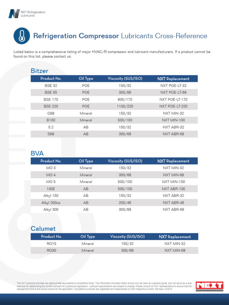 CHAPTER 12. LUBRICANTS IN REFRIGERANT SYSTEMS Refrigerant Oil Viscosity Although vapor pressure is only minimally affected by the addition of 10 and 20 weight percent oil, the viscosity of the fluid is. After determining the type of lubricant in the a/c system (mineral oil, ester or pag), it is important to determine the viscosity. Refrigeration oil is sealed inside the compressor to lubricate it; However, some of the oil. Refrigerant Oil Viscosity.