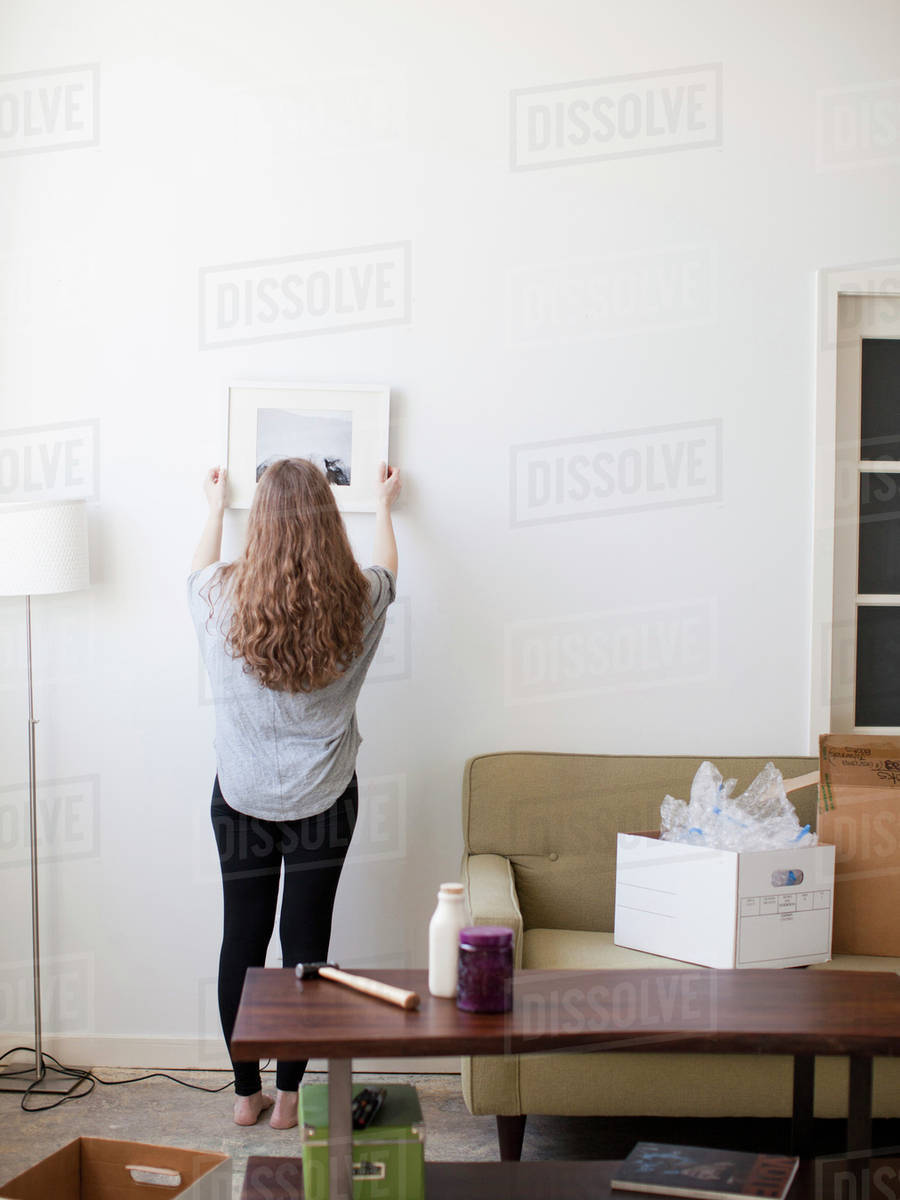 Young woman hanging picture on freshly painted wall Stock Photo How Long Should You Wait To Hang Pictures On A Freshly Painted Wall paint drying 101: But, if you are low on time like most. Ideally, you would wait for 30 days. usually, the standard time frame a wall should take before completely drying and being suitable for the addition. hanging pictures on freshly painted walls might not be the best idea. Here's how long you should wait for your. How Long Should You Wait To Hang Pictures On A Freshly Painted Wall.
