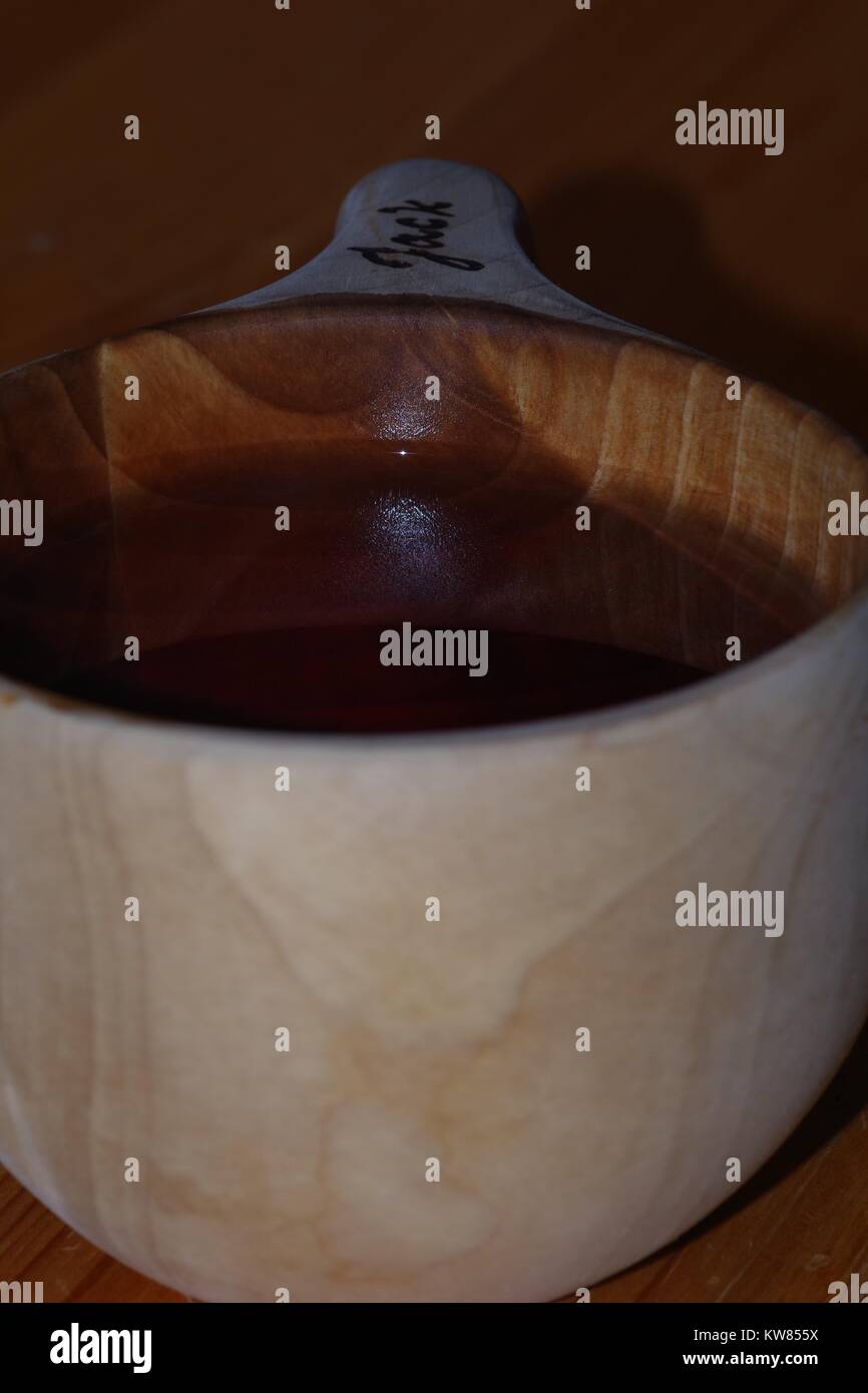 Red Berry Juice Drink in Finnish Wooden Kuksa Cup. Winter 2017 Stock
