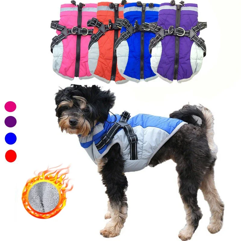 WinterThickenDogJacketWarmwithHarnessPetCoatWaterproofPuppy