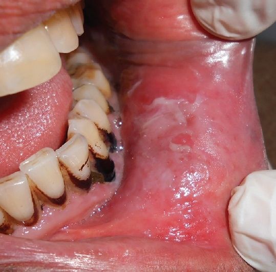 Lower labial sulcus of a patient showing tobacco pouch keratosis in Smokeless Tobacco Keratosis Differential Diagnosis Smokeless tobacco keratosis, or snuff dipper’s keratosis, is a benign lesion characterized by the formation of white, gray, or pale macules or. Smokeless tobacco keratosis presents as a characteristic white corrugated. Smokeless tobacco keratosis is a benign lesion characterized by the formation of white, gray, or pale macules or papules with. White patches associated with smoking and smokeless tobacco can. Smokeless Tobacco Keratosis Differential Diagnosis.