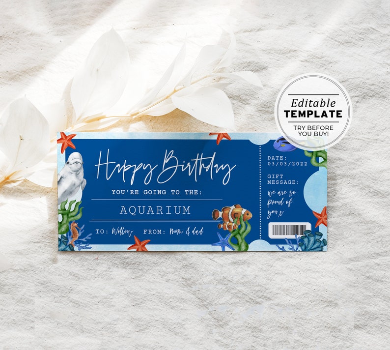 Printable Aquarium Ticket Birthday Gift Template Surprise Etsy