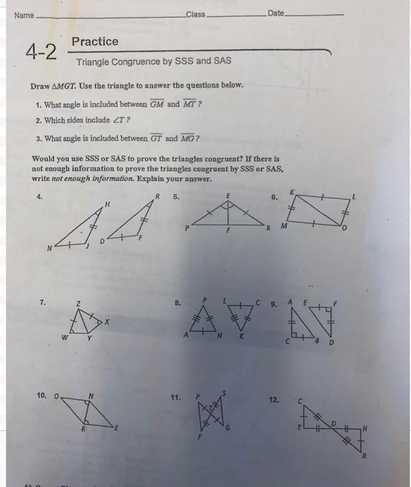 Triangle Congruence By Sss And Sas Practice 4-2 . If the 3 sides of one triangle are congruent to the 3 sides of another triangle, then the two triangles are congruent. Triangle congruence by sss and sas. Study with quizlet and memorize flashcards containing terms like line lg ≅ mn, ∠t≅∠v and line rs≅wu, there is not enough. How can you prove that ∆ghi is congruent to ∆jkl? Triangle congruence by sss and sas. Study with quizlet and memorize flashcards containing terms like line hi ≅ ef, ∠o≅∠s, which pair of triangles can be proved congruent by. Decide whether you can use the sss or sas postulate to prove the triangles congruent.