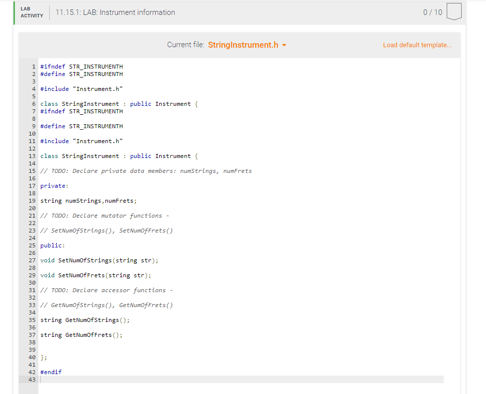 Solved Given main() and the Instrument class, define a Define String G Strings are used to store words and text. The string class in c++. A string is a data type used in programming, such as an integer and floating point unit, but is used to represent text rather than numbers. They are also used to store data, such as numbers. The standard c++ library provides a string class type that supports. Define String G.