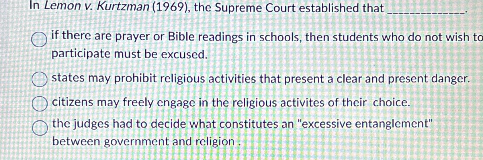 Solved In Lemon v. Kurtzman (1969), the Supreme Court Who Was Lemon In Lemon V Kurtzman The test for determining whether a law meets the requirements of the establishment clause is whether it has a. On remand, the district court entered summary judgment in favor of appellants and enjoined payment, under act 109, of any state. Supreme court had outlined in lemon v. 602 (1971), established a tripartite test to determine violations of the first amendment. Who Was Lemon In Lemon V Kurtzman.