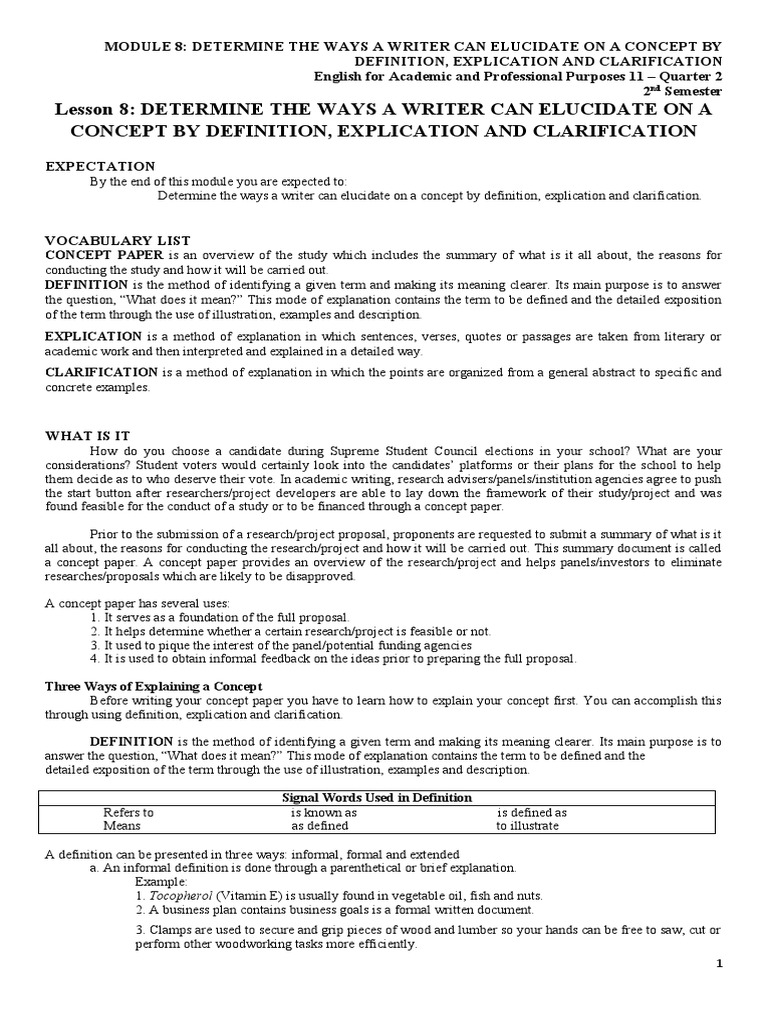 EAPP Q1 W6 (Elucidating Concept through Definition, Explication and Concept Paper Definition Explication And Clarification This document provides guidance on writing a concept paper, which summarizes a proposed project prior to submitting a full proposal. This document outlines objectives and techniques for elucidating concepts in a concept paper, including definition, explication, and. Determine the ways a writer can elucidate on a concept by definition, explication and. This article provides a guide to this task, organized. Concept Paper Definition Explication And Clarification.