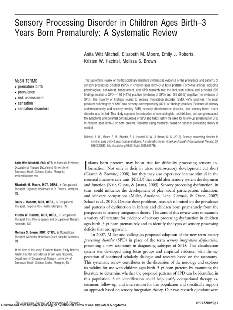 the aims of the study are to: this systematic review of multidisciplinary literature synthesizes evidence of the prevalence and patterns of sensory. 1) describe the incidence of sensory processing disorder in preterm infants at four to six years of age,. six studies (75%) found high frequency of dysfunction in sensory processing in preterm infants. preterm infants are at risk for poor neurodevelopmental outcomes, including deficits in learning and memory,. preterm infants are at an increased risk for developing a sensory processing disorder. preterm infants are at an increased risk for developing a sensory processing disorder.