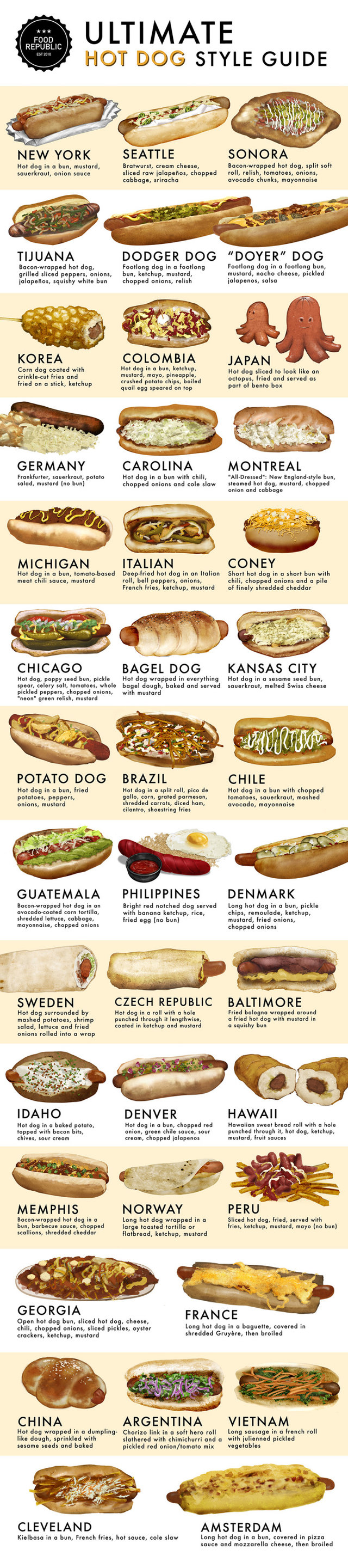 Ultimate Hot Dog Style Guide Hot Dogs of the World Thrillist Types Of Hot Dogs By City Explore 8 delicious variations and learn how to recreate them at home. take a culinary tour of america through its regional hot dog styles. while there are many regional hot dog styles, these are the most notable variants from coast to coast. a field guide to the great hot dogs of america. most recipes were products. Types Of Hot Dogs By City.