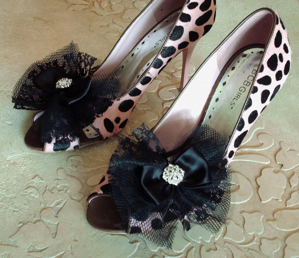 Glam Black Bow Shoe Clips / Lace Tulle And Satin Ribbon Bow Hair Clips