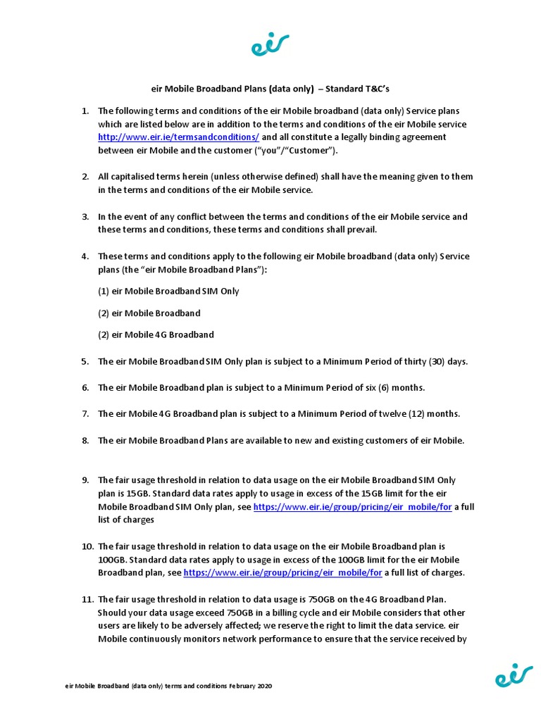 Eir Mobile Broadband Plans (Data Only) Standard T&C's PDF Access 4 G