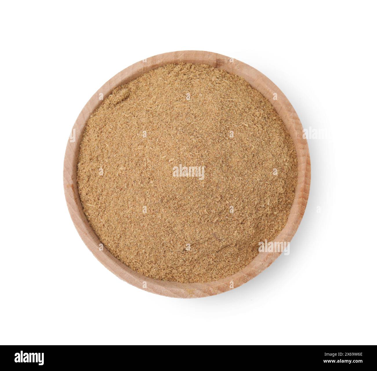 Dietary fiber. Psyllium husk powder in bowl isolated on white, top view
