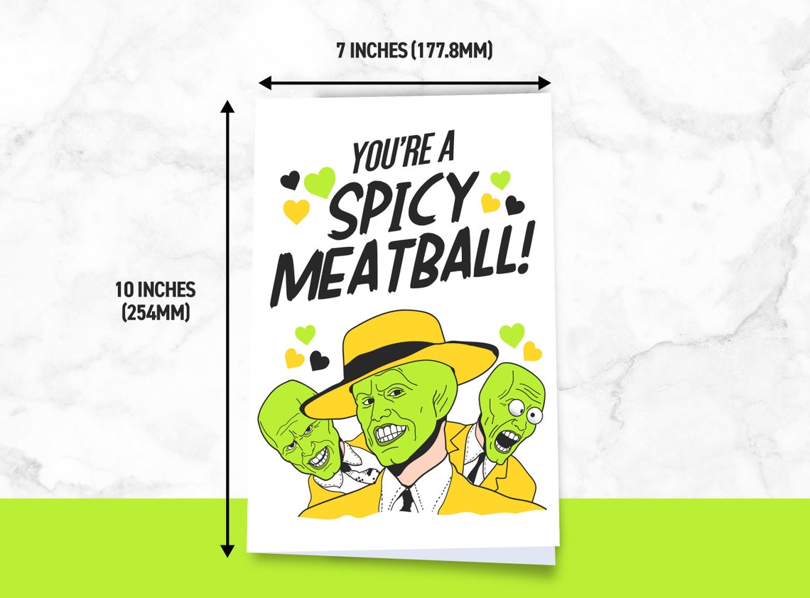 You're a Spicy Meatball The Mask Funny Valentines Card Etsy Spicy Meatballs The Mask Stanley (jim carrey) dons the mask.buy the movie:. This commercial first aired in 1969. This might be a reference to a famous advert in the '90s for alka seltzer where a man has to repeatedly eat meatballs for a commercial. This is actually a reference to a famous advert in the '90s for alka seltzer where a man has to. Spicy Meatballs The Mask.